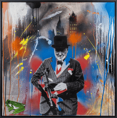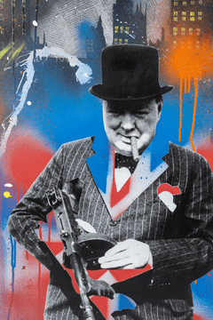 A bold portrayal of Churchill at ease but never off guard. With his signature scowl and weapon in hand, Chill Winston captures presence and power through a streetwise lens. Sharp suit, sharper attitude. It’s British grit with a modern snarl.