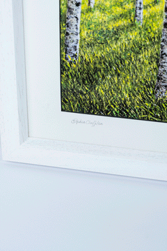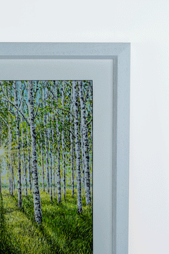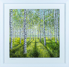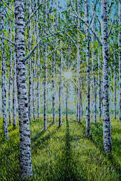 Bask in the lush greenery of summer with this mesmerizing print of a birch forest bathed in sunlight. The striking contrast of white bark against the vibrant green canopy creates an enchanting sense of depth and movement. Dappled sunlight filters through the leaves, casting long, inviting shadows on the forest floor. This piece is a tribute to the vibrancy of summer, making it an ideal addition to any space that seeks to bring the outdoors inside.