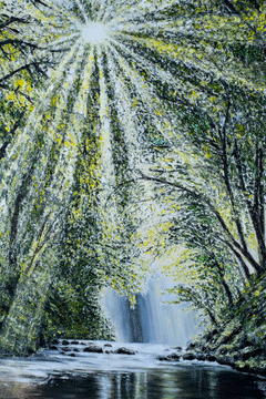 The vibrant green hues of the forest dominate the composition, with varying shades that range from deep emeralds to bright, sunlit greens, evoking a sense of vitality and renewal. These lively tones are tempered by the darker, shadowy colors of the stream, which provide a striking contrast that adds balance and tranquility to the piece. The interplay of light and shadow, combined with the reflections in the water, creates a harmonious relationship between the earth and sky, uniting the elements of nature in perfect symmetry.
