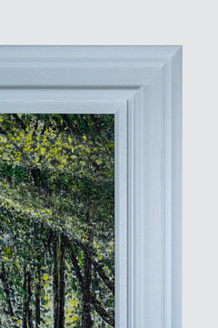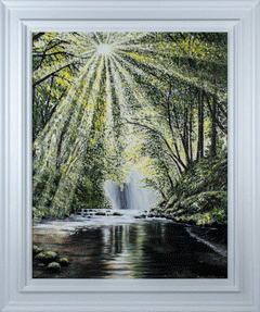 Chalklen’s signature impasto technique, characterized by thick layers of oil paint applied in bold, tactile strokes, lends the painting a dynamic texture that brings the woodland scene to life. Each brushstroke seems intentional, capturing the energy and subtle movements of the forest. You can almost hear the rustle of leaves in the gentle breeze and the faint ripple of the stream’s current. The impasto effect is particularly pronounced in the lush foliage and along the water’s surface, where the texture is so vivid it feels as though you could reach out and touch the scene.