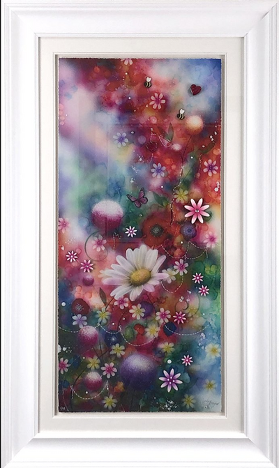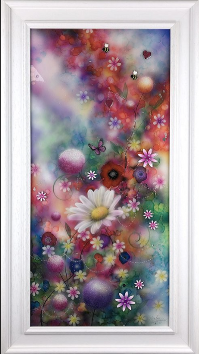 Having begun her career indulging in strong abstract pieces, dripping with colour and energy – her now signature move towards 3D elements began in 2006. The handmade elements that include glass, diamond dust, Swarovski crystals and finished by the artist herself in resin have become a much-loved fixture within her work