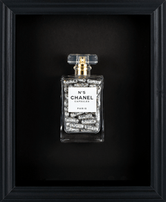 A brilliant twist on the sold-out Addiction No.5 artworks. This striking piece features a solid glass Chanel-style bottle filled with Emma’s signature handmade colourful capsules. Each artwork is float-mounted within a triple-depth shadow box frame and finished with premium Tru-Vue Museum Glass for exceptional clarity and protection. These pieces are from the 2022 issue date, adding to their rarity and collector appeal. Bottles can be customised in Emma’s bold and vibrant colourways—choose from mixed or solid/matching capsules. The multi-coloured originals (as pictured) remain the most popular choice.