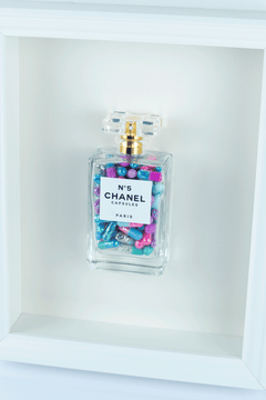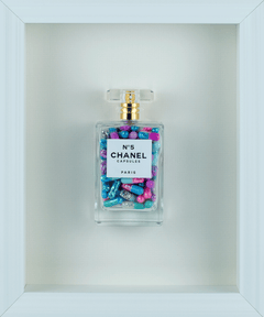 A brilliant twist on the sold-out Addiction No.5 artworks. This striking piece features a solid glass Chanel-style bottle filled with Emma’s signature handmade colourful capsules. Each artwork is float-mounted within a triple-depth shadow box frame and finished with premium Tru-Vue Museum Glass for exceptional clarity and protection. These pieces are from the 2022 issue date, adding to their rarity and collector appeal. Bottles can be customised in Emma’s bold and vibrant colourways—choose from mixed or solid/matching capsules. The multi-coloured originals (as pictured) remain the most popular choice.