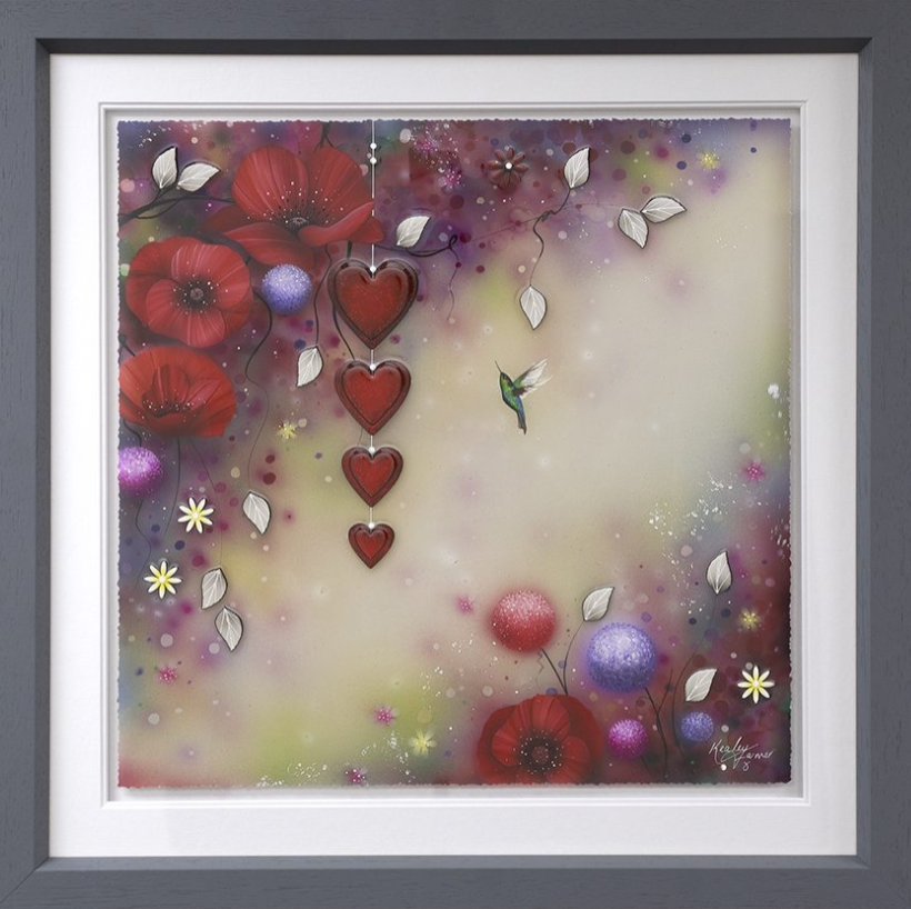 Having begun her career indulging in strong abstract pieces, dripping with colour and energy – her now signature move towards 3D elements began in 2006. The handmade elements that include glass, diamond dust, Swarovski crystals and finished by the artist herself in resin have become a much-loved fixture within her work.