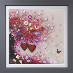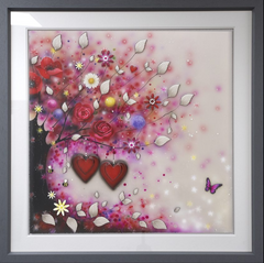 Having begun her career indulging in strong abstract pieces, dripping with colour and energy – her now signature move towards 3D elements began in 2006. The handmade elements that include glass, diamond dust, Swarovski crystals and finished by the artist herself in resin have become a much-loved fixture within her work.