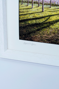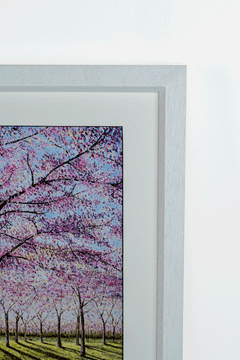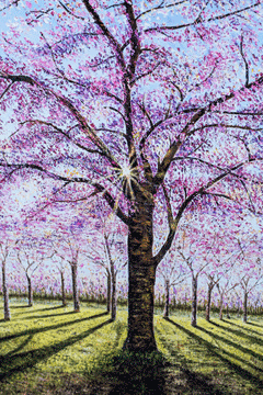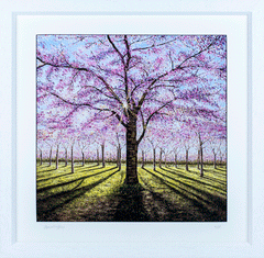 Celebrate the renewal of life with this captivating artwork showcasing a breathtaking orchard in full bloom. Soft pink cherry blossoms fill the landscape, gently swaying under the golden glow of the sun. The meticulously detailed branches and radiant shadows stretching across the grass evoke a dreamlike sense of serenity and rebirth. This print perfectly captures the essence of spring, making it an exquisite centerpiece for any nature lover’s collection.