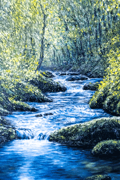 The sun casts a warm glow across the canvas, its rays shimmering on the surface of the water, creating a play of reflections that dance like diamonds. The bright blues of the stream complement the vivid greens of the surrounding trees, evoking a sense of peace and tranquility. Each brushstroke tells a story, capturing the essence of a moment when nature feels alive and infused with light.