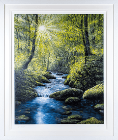 In this captivating landscape painting, “Touched by Light,” Sophia Chalklen invites viewers into a serene natural oasis. The scene unfolds with a gentle stream meandering through lush, vibrant green trees that stand tall and proud, their leaves dancing in the sunlight. The artist’s masterful use of impasto technique creates rich texture, bringing the foliage to life and allowing the colors to pop with an exuberance that is almost palpable.