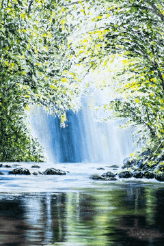 The vibrant green hues of the forest dominate the composition, with varying shades that range from deep emeralds to bright, sunlit greens, evoking a sense of vitality and renewal. These lively tones are tempered by the darker, shadowy colors of the stream, which provide a striking contrast that adds balance and tranquility to the piece. The interplay of light and shadow, combined with the reflections in the water, creates a harmonious relationship between the earth and sky, uniting the elements of nature in perfect symmetry.