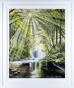 Chalklen’s signature impasto technique, characterized by thick layers of oil paint applied in bold, tactile strokes, lends the painting a dynamic texture that brings the woodland scene to life. Each brushstroke seems intentional, capturing the energy and subtle movements of the forest. You can almost hear the rustle of leaves in the gentle breeze and the faint ripple of the stream’s current. The impasto effect is particularly pronounced in the lush foliage and along the water’s surface, where the texture is so vivid it feels as though you could reach out and touch the scene.