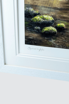 Sophia Chalklen’s “Tranquility” invites viewers to immerse themselves in a serene woodland sanctuary, where the peaceful beauty of nature is brought to life through the artist’s rich and expressive brushstrokes. At the center of the composition, a dark, placid stream weaves its way through the dense forest, beckoning the viewer’s gaze deeper into the landscape. The water mirrors the towering trees that line its banks, their reflections creating an almost dreamlike quality. Above, sunlight filters through the canopy of leaves, casting soft, dappled light onto the forest, which glows with warmth and depth.