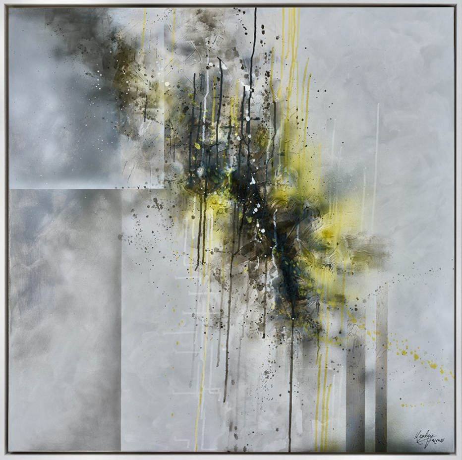 Having begun her career indulging in strong abstract pieces, dripping with colour and energy – her now signature move towards 3D elements began in 2006. The handmade elements that include glass, diamond dust, Swarovski crystals and finished by the artist herself in resin have become a much-loved fixture within her work.