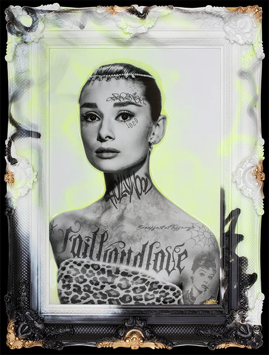 Unapologetically bold, their mixed media artworks are uniquely embellished and finished with a bespoke spray paint frame.