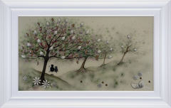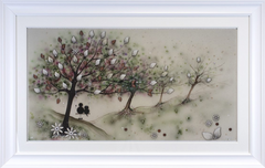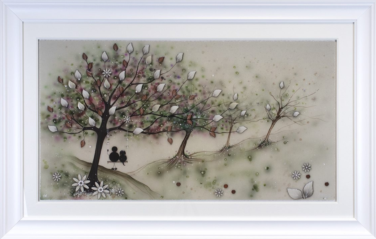 Having begun her career indulging in strong abstract pieces, dripping with colour and energy – her now signature move towards 3D elements began in 2006. The handmade elements that include glass, diamond dust, Swarovski crystals and finished by the artist herself in resin have become a much-loved fixture within her work