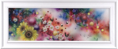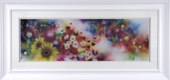 Having begun her career indulging in strong abstract pieces, dripping with colour and energy – her now signature move towards 3D elements began in 2006. The handmade elements that include glass, diamond dust, Swarovski crystals and finished by the artist herself in resin have become a much-loved fixture within her work