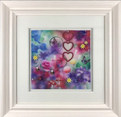 Having begun her career indulging in strong abstract pieces, dripping with colour and energy – her now signature move towards 3D elements began in 2006. The handmade elements that include glass, diamond dust, Swarovski crystals and finished by the artist herself in resin have become a much-loved fixture within her work.
