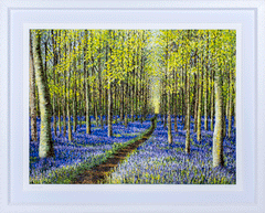 This captivating piece, titled Everlasting, transports the viewer into a serene bluebell woodland, where nature’s beauty is both vibrant and inviting. A meandering path gently leads the eye deeper into the heart of the forest, surrounded by towering trees with lush, green leaves. On either side of the path, soft violet-bluebells blanket the forest floor, creating a peaceful contrast against the earthy tones of the path itself.