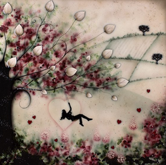 Having begun her career indulging in strong abstract pieces, dripping with colour and energy – her now signature move towards 3D elements began in 2006. The handmade elements that include glass, diamond dust, Swarovski crystals and finished by the artist herself in resin have become a much-loved fixture within her work.