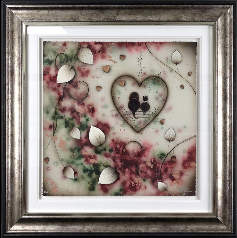Having begun her career indulging in strong abstract pieces, dripping with colour and energy – her now signature move towards 3D elements began in 2006. The handmade elements that include glass, diamond dust, Swarovski crystals and finished by the artist herself in resin have become a much-loved fixture within her work.