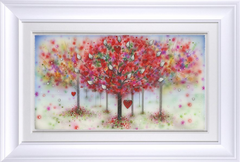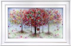 Having begun her career indulging in strong abstract pieces, dripping with colour and energy – her now signature move towards 3D elements began in 2006. The handmade elements that include glass, diamond dust, Swarovski crystals and finished by the artist herself in resin have become a much-loved fixture within her work
