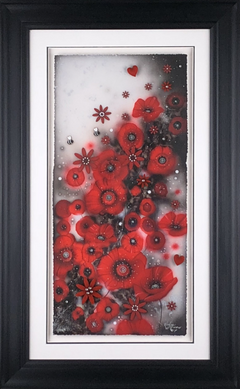 Having begun her career indulging in strong abstract pieces, dripping with colour and energy – her now signature move towards 3D elements began in 2006. The handmade elements that include glass, diamond dust, Swarovski crystals and finished by the artist herself in resin have become a much-loved fixture within her work.