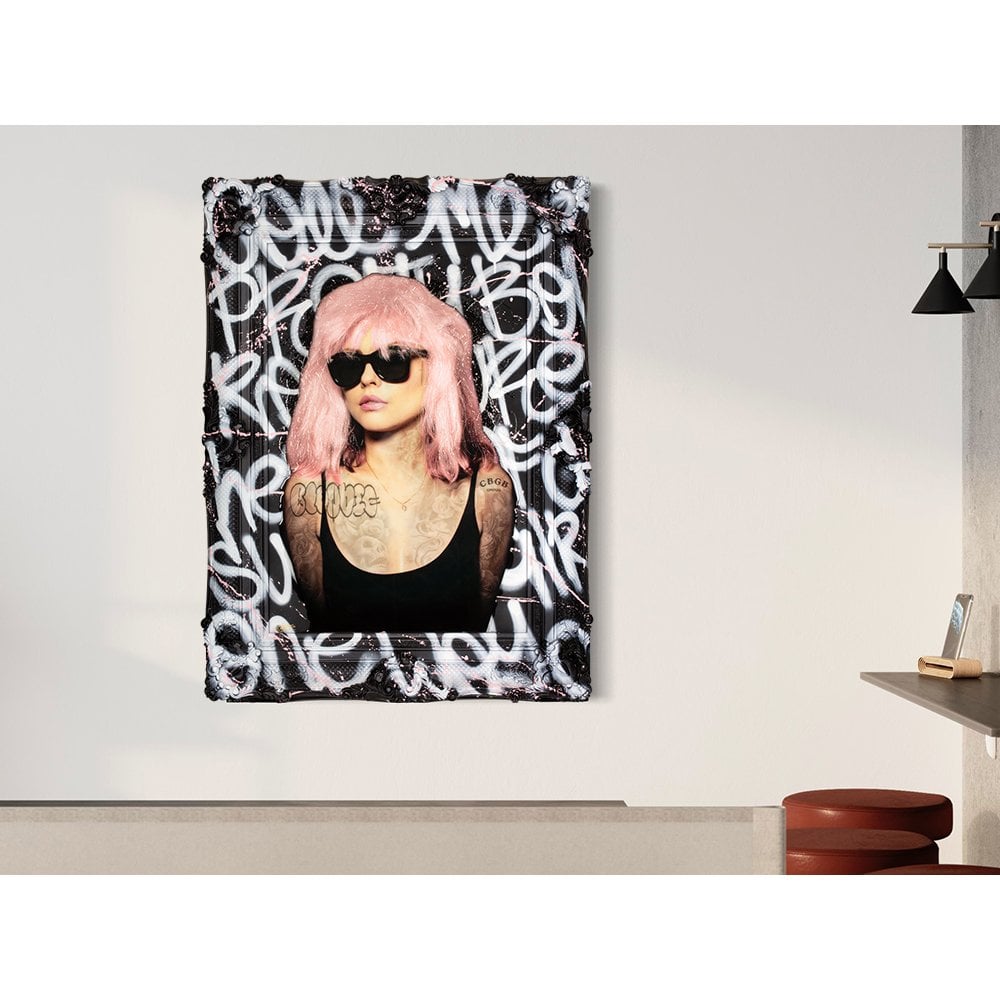 Unapologetically bold, their mixed media artworks are uniquely embellished and finished with a bespoke spray paint frame.