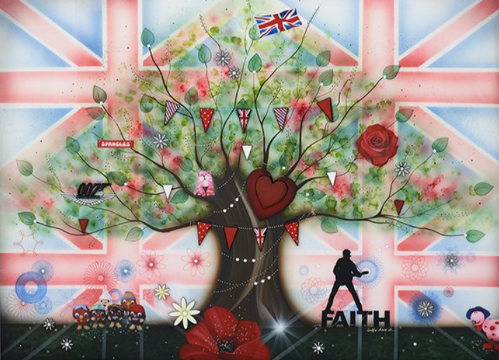 Having begun her career indulging in strong abstract pieces, dripping with colour and energy – her now signature move towards 3D elements began in 2006. The handmade elements that include glass, diamond dust, Swarovski crystals and finished by the artist herself in resin have become a much-loved fixture within her work.