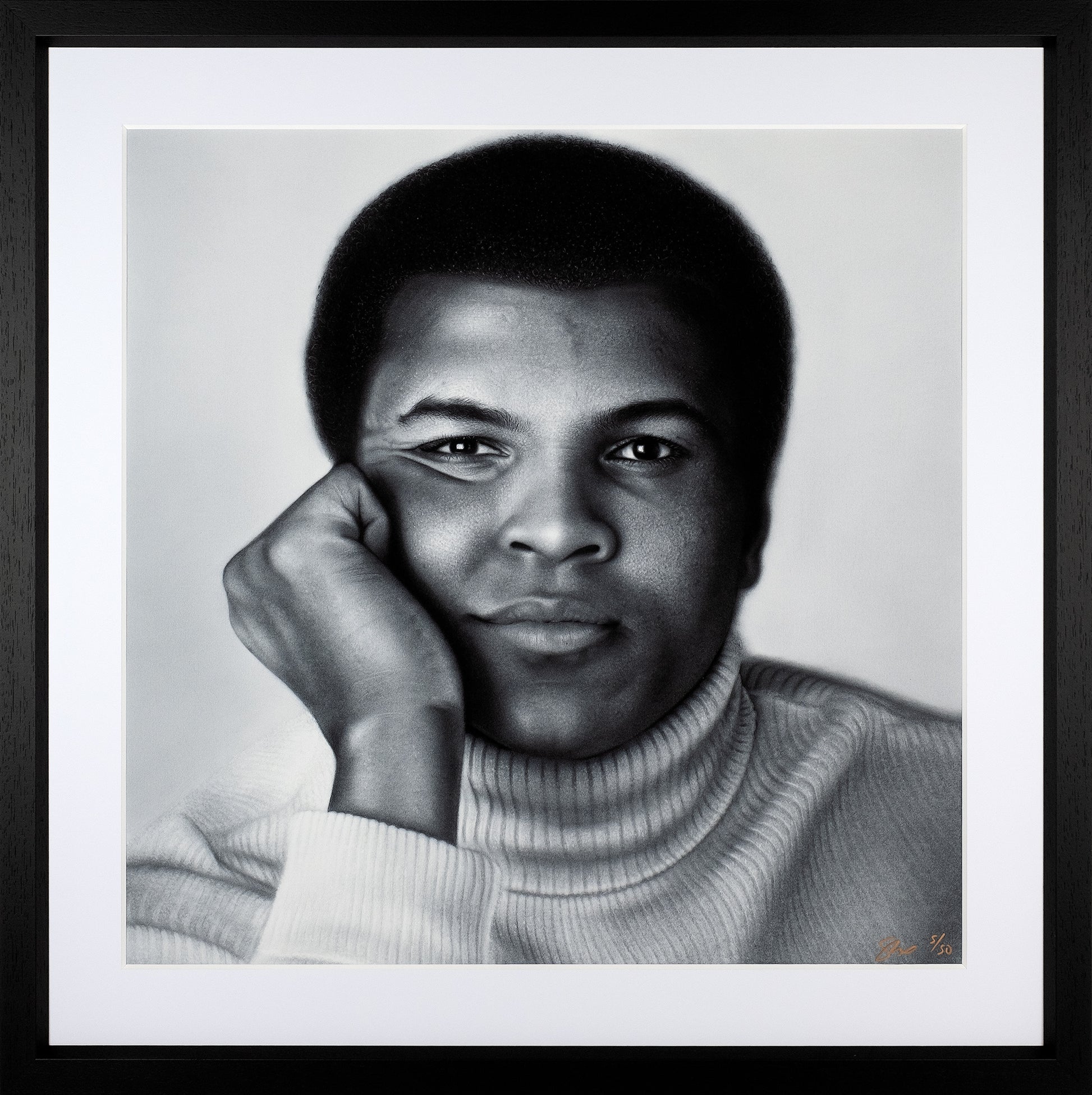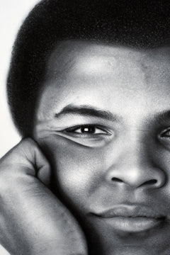 This hyper-realistic charcoal and graphite drawing captures the iconic Muhammad Ali in a moment of quiet contemplation, his expressive eyes staring directly at the viewer. The artwork portrays Ali resting his head on his hand while wearing a white roll-neck sweater, an unusual but striking pose for the legendary boxer known for his boldness and charisma. The detailed shading and texture in the drawing bring depth and life to his gaze, capturing the essence of the man behind the legend.