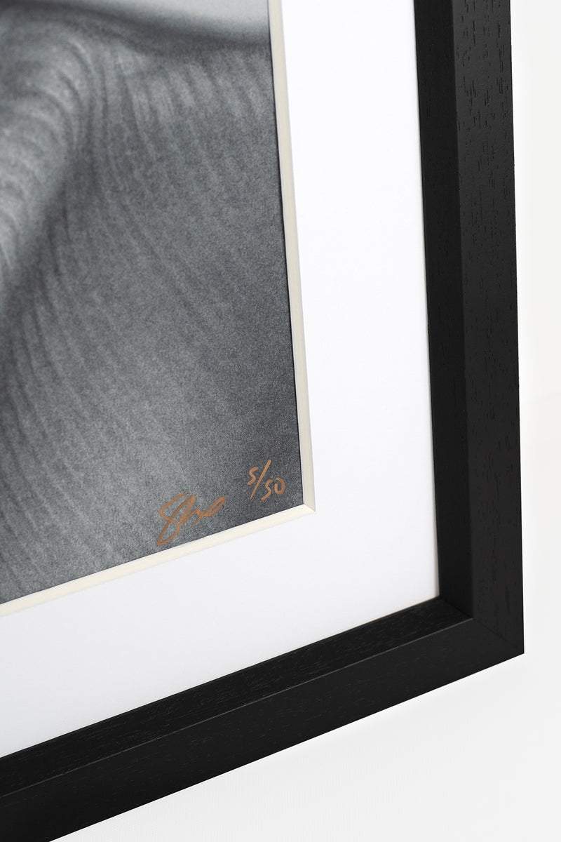 Framed by our expert in-house team with over four decades of experience, this piece is mounted in a sleek black frame that complements the monochromatic tones of the artwork. The mounting adds sophistication, while a art glass in front protects the piece, ensuring it remains pristine and protected from UV.