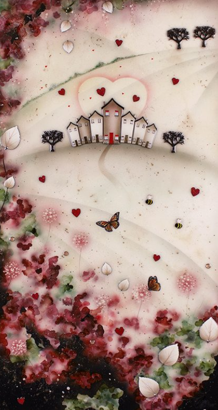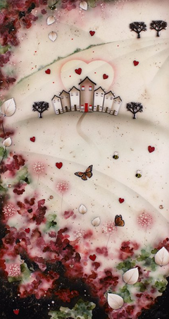 Having begun her career indulging in strong abstract pieces, dripping with colour and energy – her now signature move towards 3D elements began in 2006. The handmade elements that include glass, diamond dust, Swarovski crystals and finished by the artist herself in resin have become a much-loved fixture within her work.