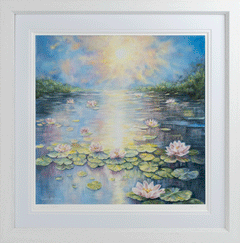 This artwork is a serene and luminous depiction of a tranquil water lily pond under the warm glow of the sun. The painting captures a dreamy atmosphere, with soft pastel tones blending into vibrant greens and blues. The sunlight reflects beautifully on the rippling water, creating a sense of calm and serenity. The delicate water lilies, painted with intricate detail, float gracefully atop the water, surrounded by lush foliage in the background. Encased in an elegant white frame, this piece adds a touch of sophistication and tranquillity to any space, making it perfect for those who appreciate peaceful, nature-inspired art.