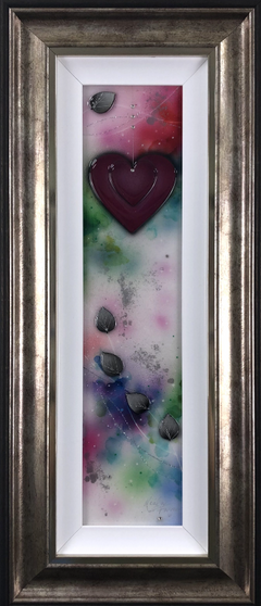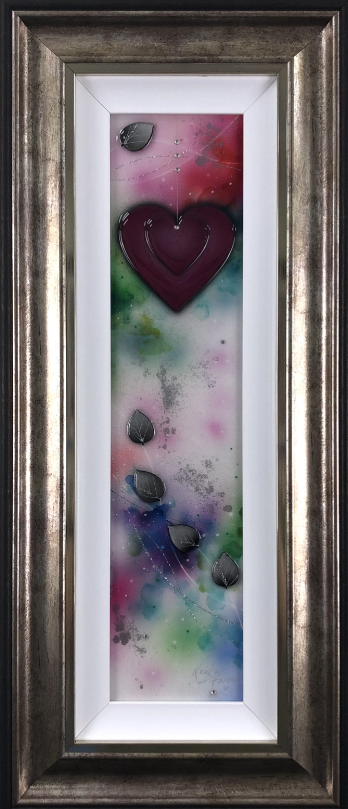 Having begun her career indulging in strong abstract pieces, dripping with colour and energy – her now signature move towards 3D elements began in 2006. The handmade elements that include glass, diamond dust, Swarovski crystals and finished by the artist herself in resin have become a much-loved fixture within her work.