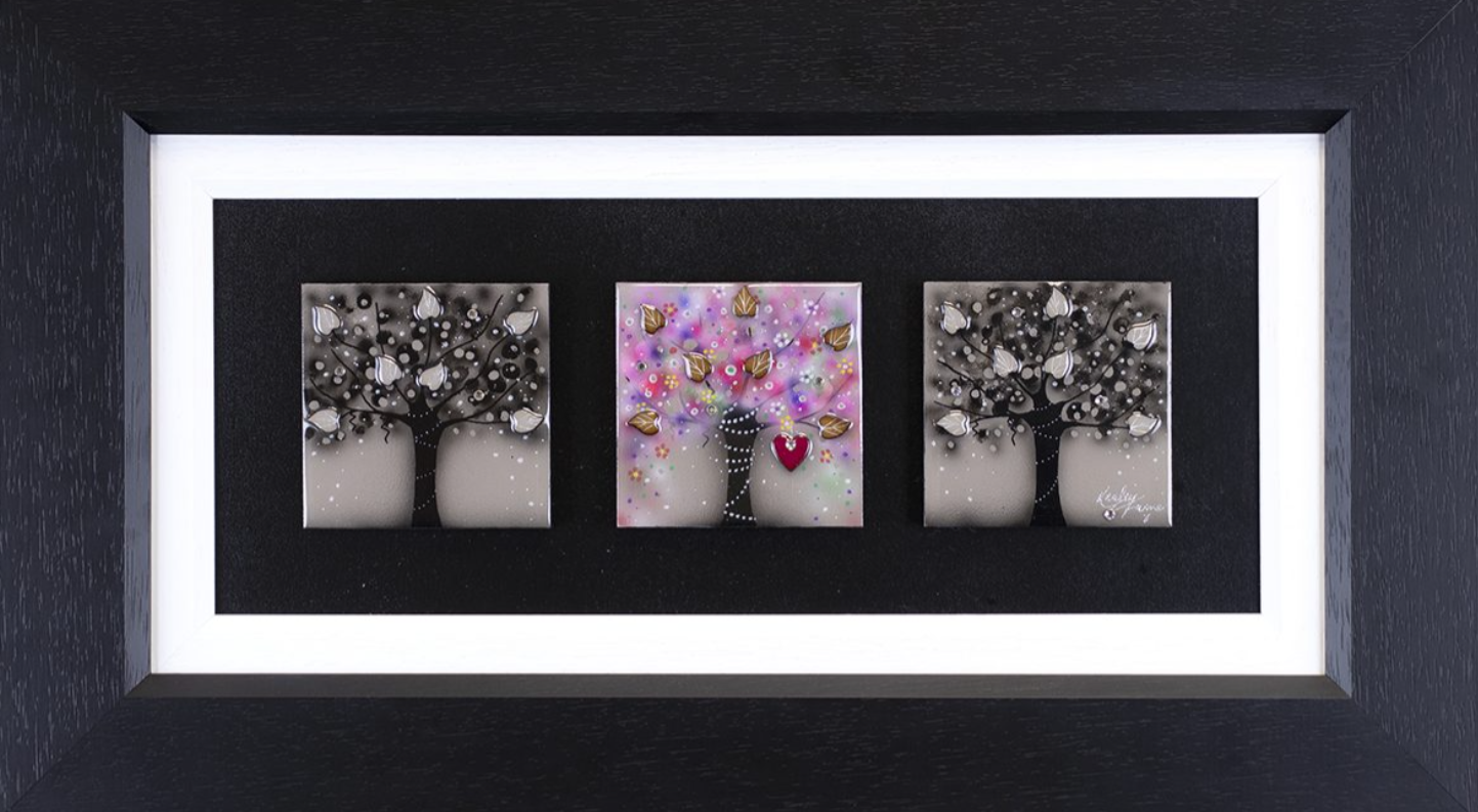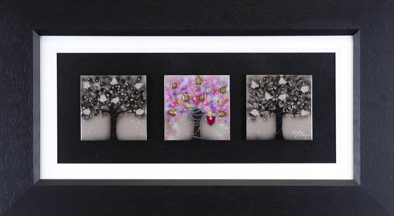 Having begun her career indulging in strong abstract pieces, dripping with colour and energy – her now signature move towards 3D elements began in 2006. The handmade elements that include glass, diamond dust, Swarovski crystals and finished by the artist herself in resin have become a much-loved fixture within her work.