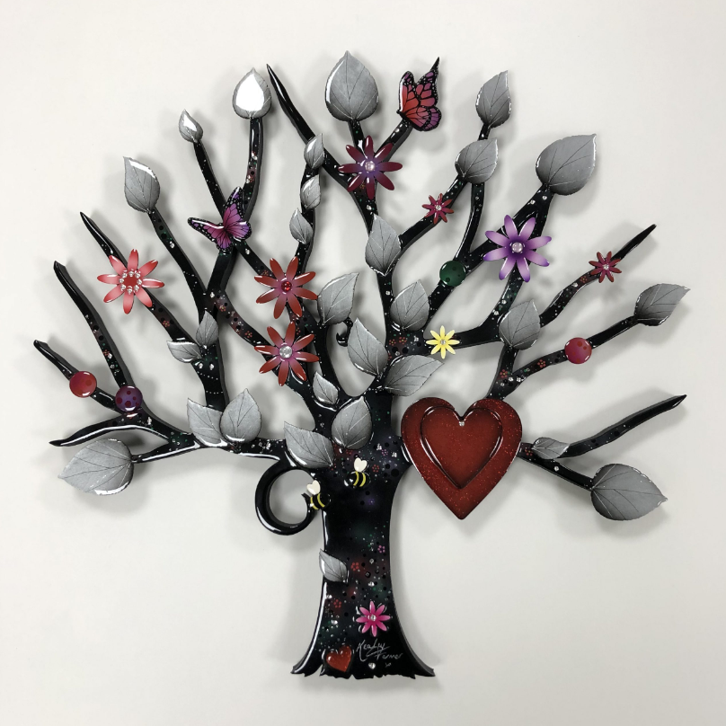 Having begun her career indulging in strong abstract pieces, dripping with colour and energy – her now signature move towards 3D elements began in 2006. The handmade elements that include glass, diamond dust, Swarovski crystals and finished by the artist herself in resin have become a much-loved fixture within her work.