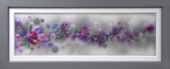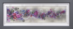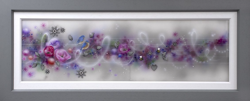 Having begun her career indulging in strong abstract pieces, dripping with colour and energy – her now signature move towards 3D elements began in 2006. The handmade elements that include glass, diamond dust, Swarovski crystals and finished by the artist herself in resin have become a much-loved fixture within her work