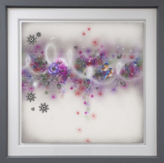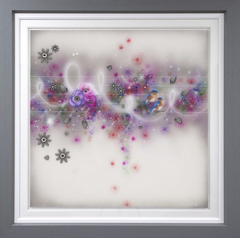 Having begun her career indulging in strong abstract pieces, dripping with colour and energy – her now signature move towards 3D elements began in 2006. The handmade elements that include glass, diamond dust, Swarovski crystals and finished by the artist herself in resin have become a much-loved fixture within her work