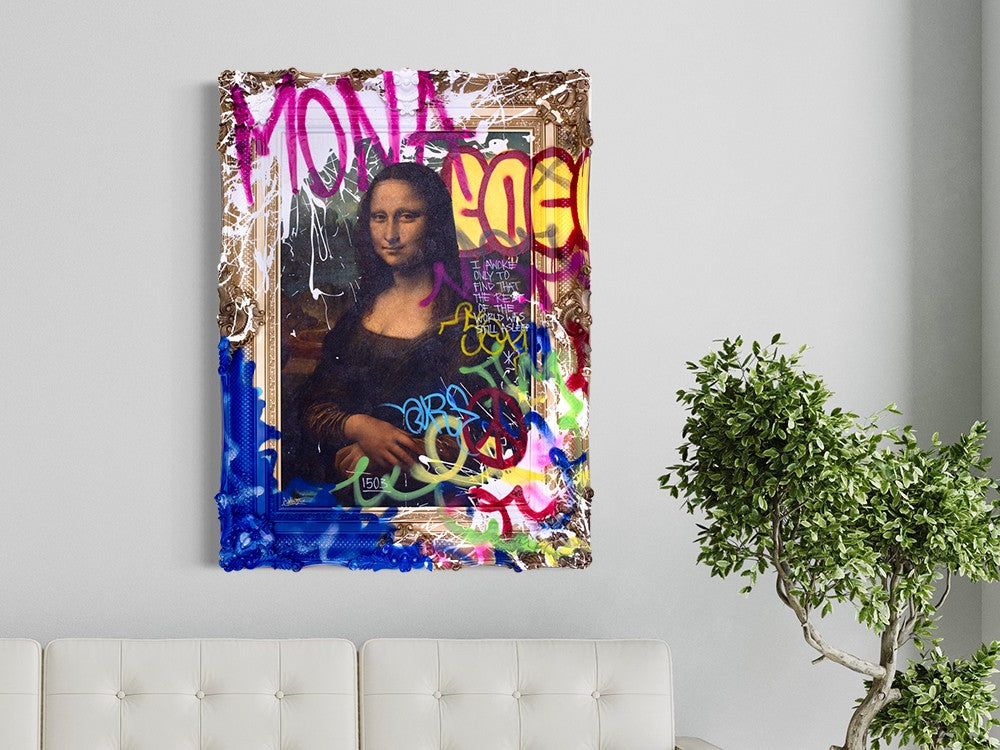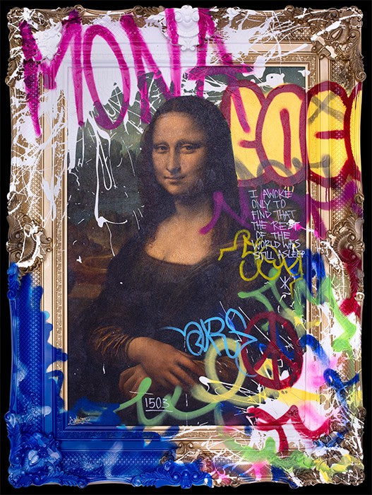 Unapologetically bold, their mixed media artworks are uniquely embellished and finished with a bespoke spray paint frame.