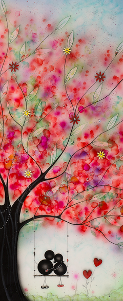Having begun her career indulging in strong abstract pieces, dripping with colour and energy – her now signature move towards 3D elements began in 2006. The handmade elements that include glass, diamond dust, Swarovski crystals and finished by the artist herself in resin have become a much-loved fixture within her work.