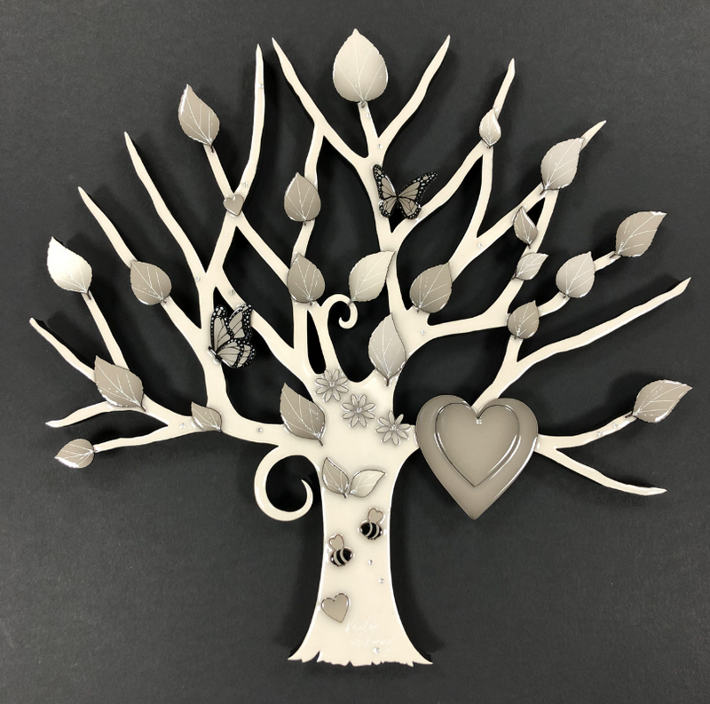 Having begun her career indulging in strong abstract pieces, dripping with colour and energy – her now signature move towards 3D elements began in 2006. The handmade elements that include glass, diamond dust, Swarovski crystals and finished by the artist herself in resin have become a much-loved fixture within her work.