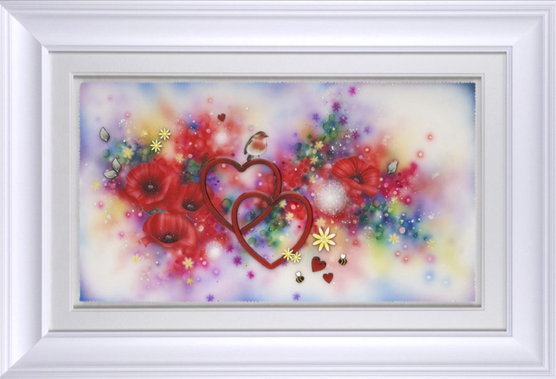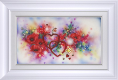 Having begun her career indulging in strong abstract pieces, dripping with colour and energy – her now signature move towards 3D elements began in 2006. The handmade elements that include glass, diamond dust, Swarovski crystals and finished by the artist herself in resin have become a much-loved fixture within her work.